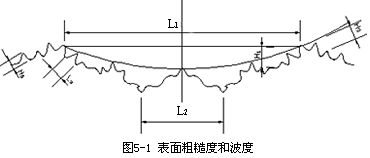 加工表面的微觀幾何特征主要包括表面粗糙度和表面波度兩部分組成,如圖 5— 1所示。表面粗糙度是波距 L小于 1mm的表面微小波紋;表面波度是指波距 L在 1~ 20mm之間的表面波紋。通常情況下,當(dāng) L/H(波距 /波高)﹤ 50時(shí)為表面粗糙度, L/H=50~ 1000時(shí)為表面波度。