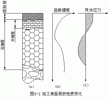 表面層的物理力學(xué)性能包括表面層的加工硬化、殘余應(yīng)力和表面層的金相組織變化。機(jī)械零件在加工中由于受切削力和熱的綜合作用,表面層金屬的物理力學(xué)性能相對于基本金屬的物理力學(xué)性能發(fā)生了變化。圖 5— 2a所示為零件表面層沿深度方向的變化。最外層生成有氧化膜或其他化合物,并吸收、滲進(jìn)氣體粒子,稱為吸附層。吸附層下是壓縮層,它是由于切削力的作用造成的塑性變形區(qū),其上部是由于刀具的擠壓摩擦而產(chǎn)生的纖維層。切削熱的作用也會(huì)使工件表面層材料產(chǎn)生相變及晶粒大小變化。