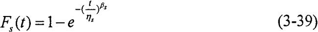 根據(jù)故障樹對(duì)圓柱正弦活齒減速器進(jìn)行可靠性的數(shù)字仿真研究。各基本部件壽命分布參數(shù)見表3-5,采用上述算法編程求解。通掃故障樹5000次,產(chǎn)生減速器壽命抽樣值5000個(gè),設(shè)系統(tǒng)最大工作時(shí)間Tmax為1000Oh,將Tmax分為1000個(gè)區(qū)間,統(tǒng)計(jì)減速器壽命抽樣落入各區(qū)間的次數(shù),得到系統(tǒng)平均壽命,即減速器平均無故障工作時(shí)間MTBF為3086h,壽命的方差為6.39×106。根據(jù)仿真結(jié)果進(jìn)行擬合分析,系統(tǒng)壽命服從威布爾分布,即