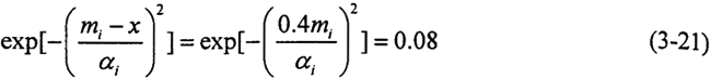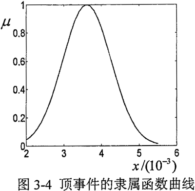 故障樹中各事件發(fā)生的概率用模糊數(shù)來表示,根據(jù)模糊數(shù)的運(yùn)算法則式(3-13)、(3-15)和模糊算子AND和OR的計(jì)算方法式(3-18)、(3-20)即可確定頂事件發(fā)生的模糊概率。假定事件發(fā)生概率Pi的參照函數(shù)為正態(tài)對(duì)稱型,其隸屬函數(shù)如式(3-11)所示,且與均值mi相差±40%的點(diǎn)x的隸屬度為0.08,則
