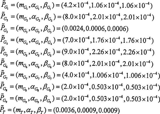 據(jù)式(3-20)及表3-3中所列的真值函數(shù)形式,計(jì)算可得各中間事件及頂事件發(fā)生概率的模糊數(shù)為: