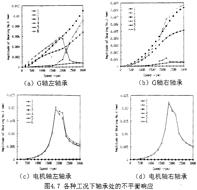 比較圖4.5a和4.6a可見,同樣在G軸的大齒輪上存在不平衡量,單軸和耦合系統(tǒng)所產(chǎn)生的響應(yīng)卻有較大的差別。用單個(gè)G軸計(jì)算,從G軸的左端開始到右軸承不平衡響應(yīng)幅值變化比較平緩,隨后迅速增大,在外伸端達(dá)到最大值;而用耦合系統(tǒng)來(lái)計(jì)算,則在G軸的左端振幅最大,比用單個(gè)G軸計(jì)算所得值在同一位置高得多,隨后迅速減小,在G軸的右軸承處振幅最小,之后又迅速增大,在外伸端達(dá)到一極值,但比用單個(gè)G軸所得值小,這一特點(diǎn)表明,耦合后G軸外伸端的不平衡響應(yīng)受到一定程度的抑制;從圖4.6b可知,聯(lián)軸器的不平衡量對(duì)本身的振動(dòng)產(chǎn)生較大的影響,對(duì)G軸左右軸承的影響較小,當(dāng)然這與聯(lián)軸器的不平衡量密切相關(guān),如果聯(lián)軸器的不平衡量較大,則另當(dāng)別論;由圖4.6f可見,在G軸、聯(lián)軸器和電機(jī)軸上同時(shí)存在不平衡量時(shí),在工作轉(zhuǎn)速下,聯(lián)軸器處的響應(yīng)幅值很大,與圖4.6b相比可知,聯(lián)軸器處的振動(dòng)是G軸、聯(lián)軸器本身和電機(jī)軸三處不平衡力綜合作用的反應(yīng),聯(lián)軸器處振動(dòng)過(guò)大對(duì)其可靠運(yùn)行帶來(lái)不利。另外比較圖4.5和圖4.6可知,電機(jī)軸的不平衡響應(yīng)主要是由電機(jī)軸自身的不平衡造成的,G軸和聯(lián)軸器的不平衡對(duì)其影響很小。從圖4.7可見,僅在G軸上作用不平衡力,當(dāng)轉(zhuǎn)速超過(guò)1000(rpm)后,用耦合系統(tǒng)計(jì)算所得G軸軸承上的振幅明顯大于用單個(gè)G軸所得值,而且隨轉(zhuǎn)速增大,變化越明顯。在工作轉(zhuǎn)速下,二軸承處的振幅前者分別是后者的1.60倍和1.66倍,這表明用單個(gè)G軸計(jì)算G軸二側(cè)軸承的不平衡響應(yīng)是不安全的,而且實(shí)際測(cè)量[18]的結(jié)果確實(shí)要比計(jì)算所得的值要大得多。另外,在軸承處的不平衡響應(yīng),只要是用耦合系統(tǒng)進(jìn)行計(jì)算,那么在非共振區(qū)各轉(zhuǎn)子的不平衡只對(duì)本身所所在二個(gè)軸承的振幅起決定作用,而對(duì)另二個(gè)軸承影響不大。這反映了在一般情況下,一側(cè)轉(zhuǎn)子的不平衡所引起的振動(dòng)通過(guò)聯(lián)軸器而傳遞到另一側(cè)的振動(dòng)較小,這也正是齒輪聯(lián)軸器被廣泛采用的另一個(gè)優(yōu)點(diǎn)。